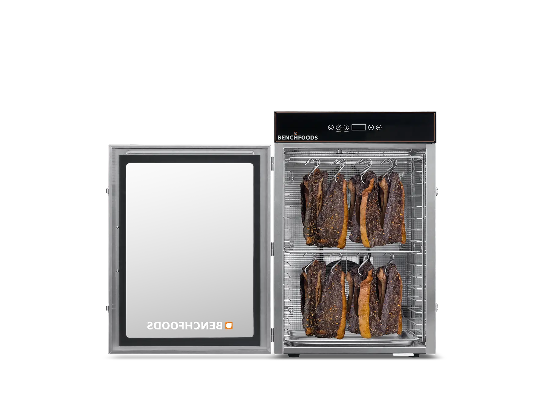 Our unique Programmable Logic Controllers (PLC) enable you to conduct staged drying cycles according to a predetermined recipe. With up to five customizable steps, each with its own programmable temperature and time settings, you can achieve precise and consistent results every time. This feature is particularly useful for “kill-step” processes when making beef jerky and for reducing dry times by starting the cycle with a higher temperature and then gradually decreasing as your product loses its moisture. With this method, you’ll achieve the same product consistency, texture, and appearance in less time without sacrificing quality.