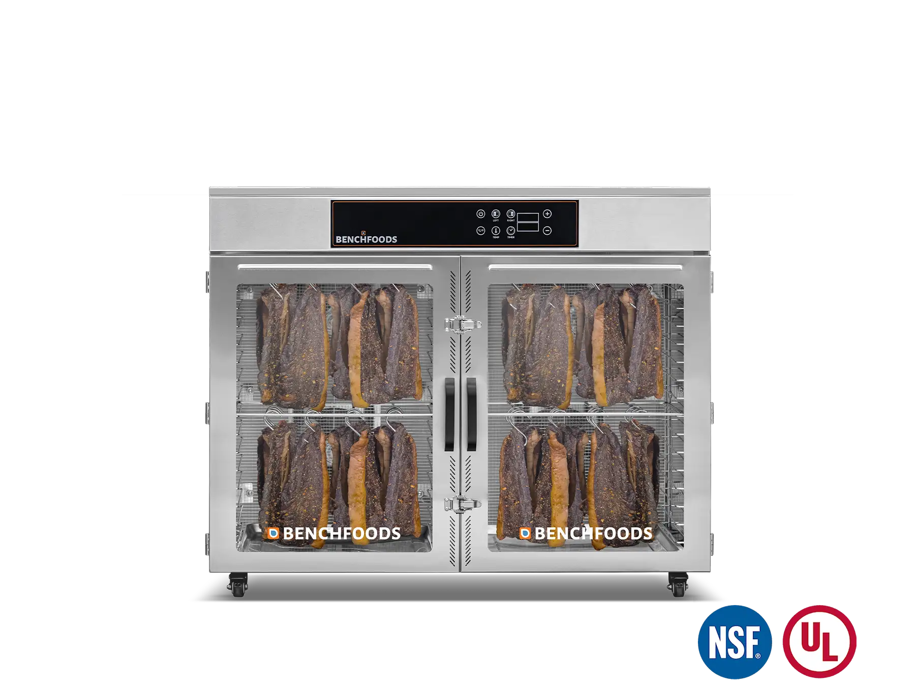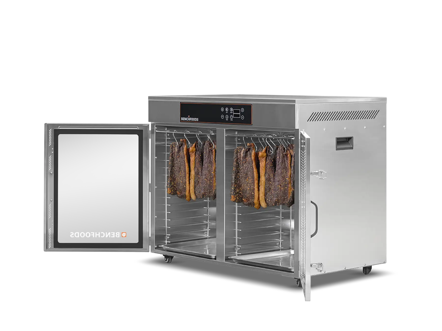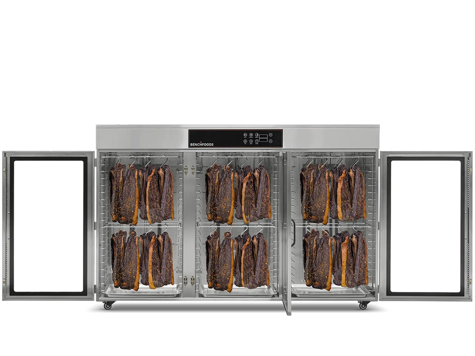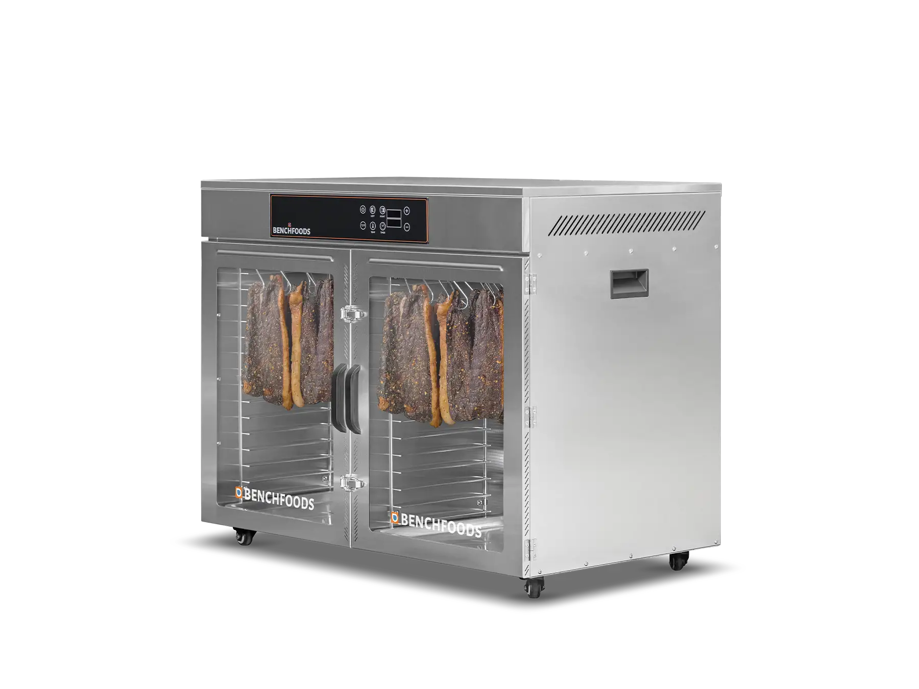 Our unique Programmable Logic Controllers (PLC) enable you to conduct staged drying cycles according to a predetermined recipe. With up to five customizable steps, each with its own programmable temperature and time settings, you can achieve precise and consistent results every time. This feature is particularly useful for “kill-step” processes when making beef jerky and for reducing dry times by starting the cycle with a higher temperature and then gradually decreasing as your product loses its moisture. With this method, you’ll achieve the same product consistency, texture, and appearance in less time without sacrificing quality.