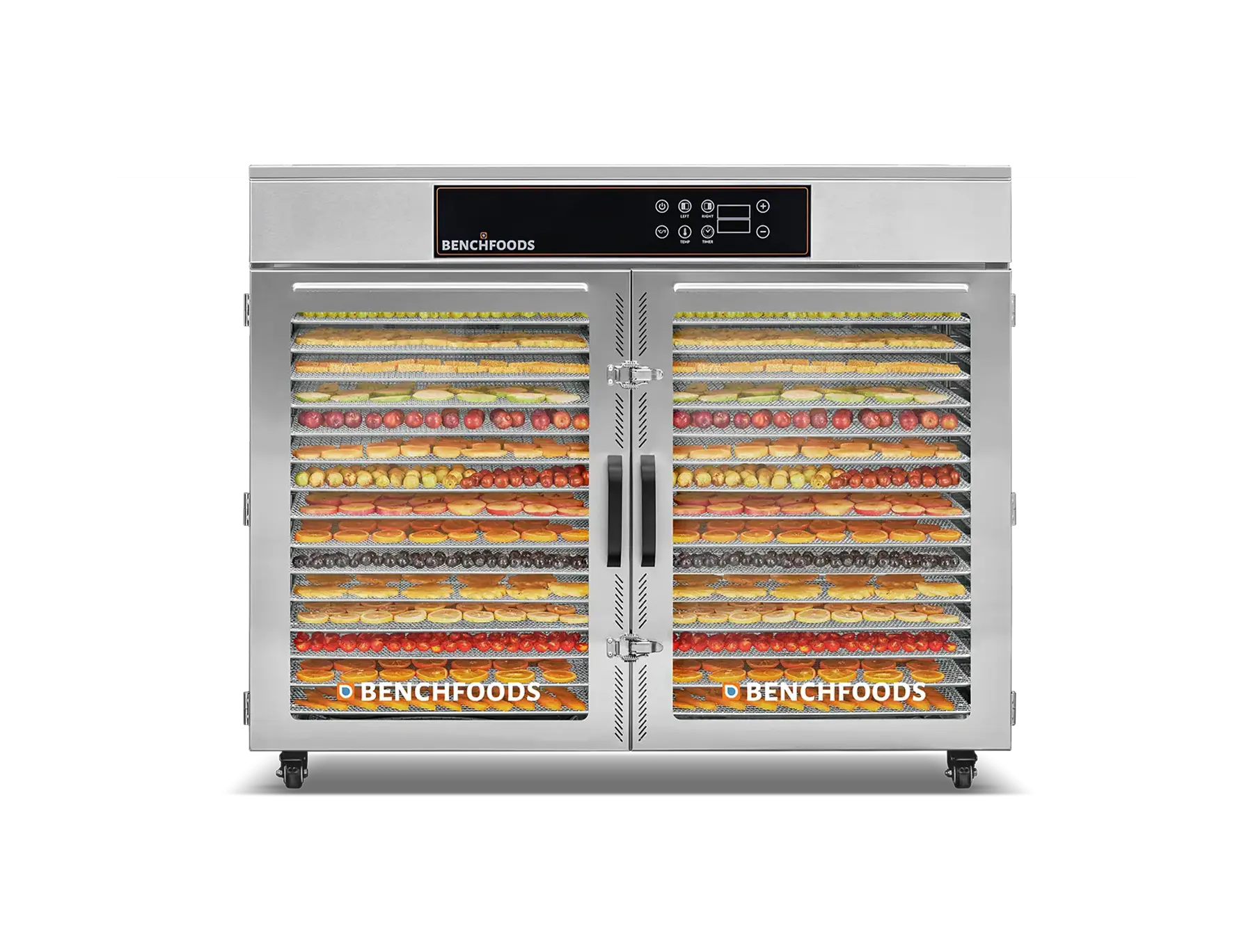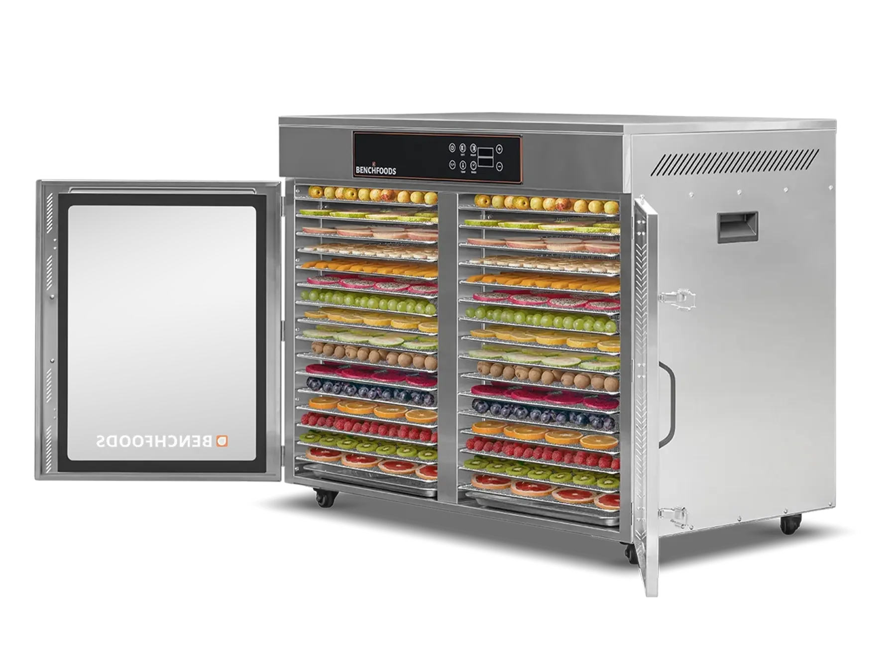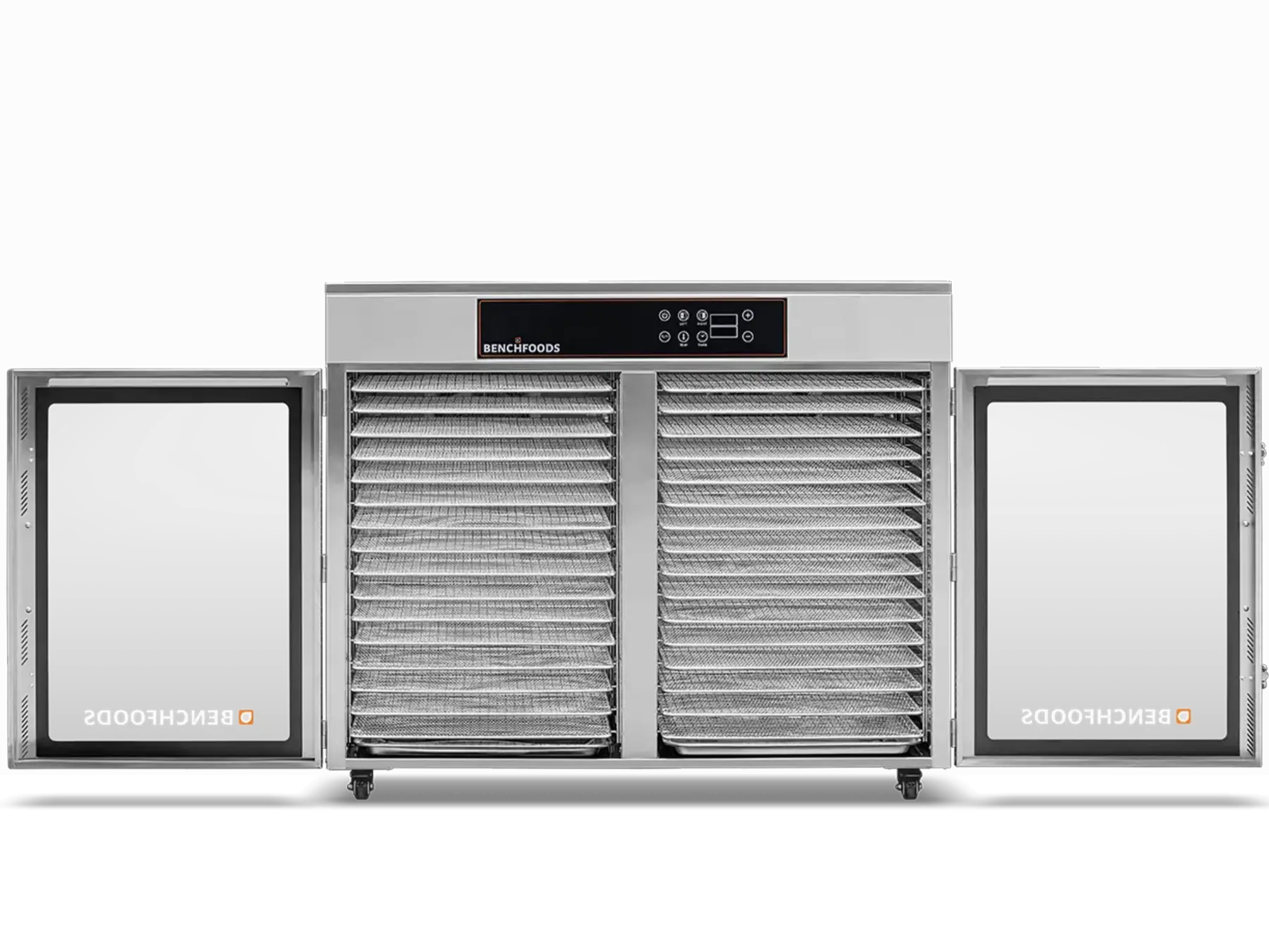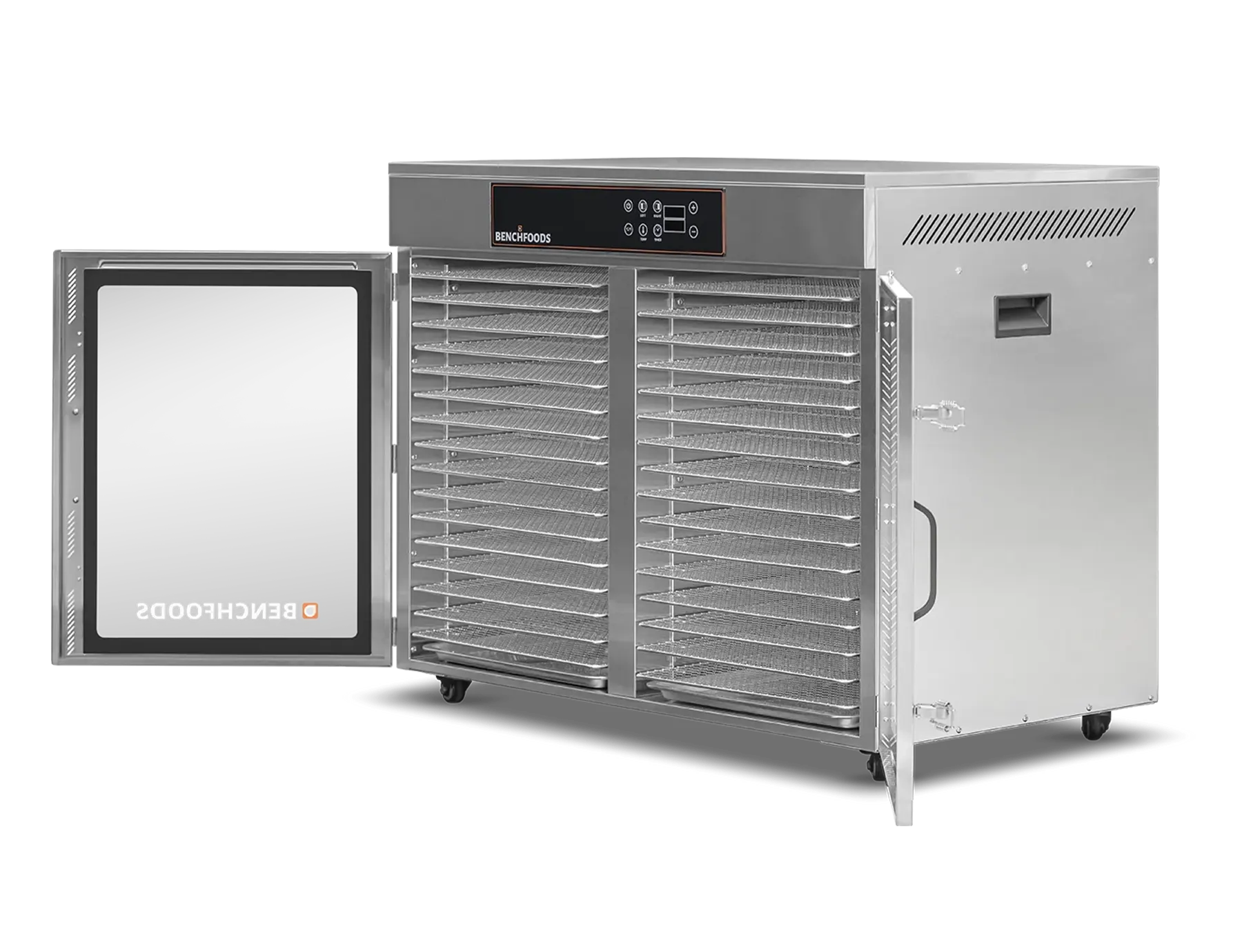 Our Industrial Dehydrators are constructed with the highest quality 304 Food-Grade Stainless Steel available. This stainless steel grade contains higher levels of chromium and nickel, which forms a protective layer on the surface, preventing corrosion (rust), and preventing the formation of bacteria and other microorganisms. Additionally, it’s non-reactive and won’t react with acidic or alkaline substances found in food and cleaning agents. This steel is also very easy to clean and sanitize, which is essential in food production facilities. In summary, using food-grade stainless steel ensures food safety and hygiene by preventing contamination and maintaining the quality of the food being processed.