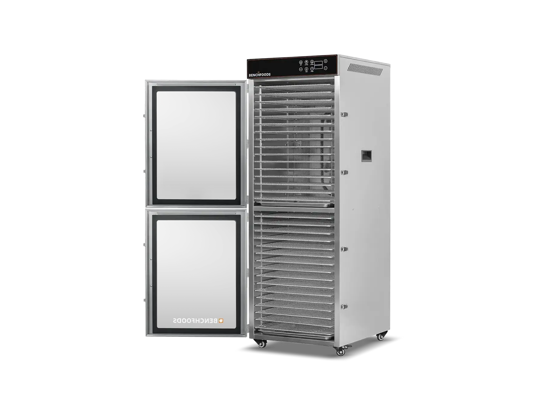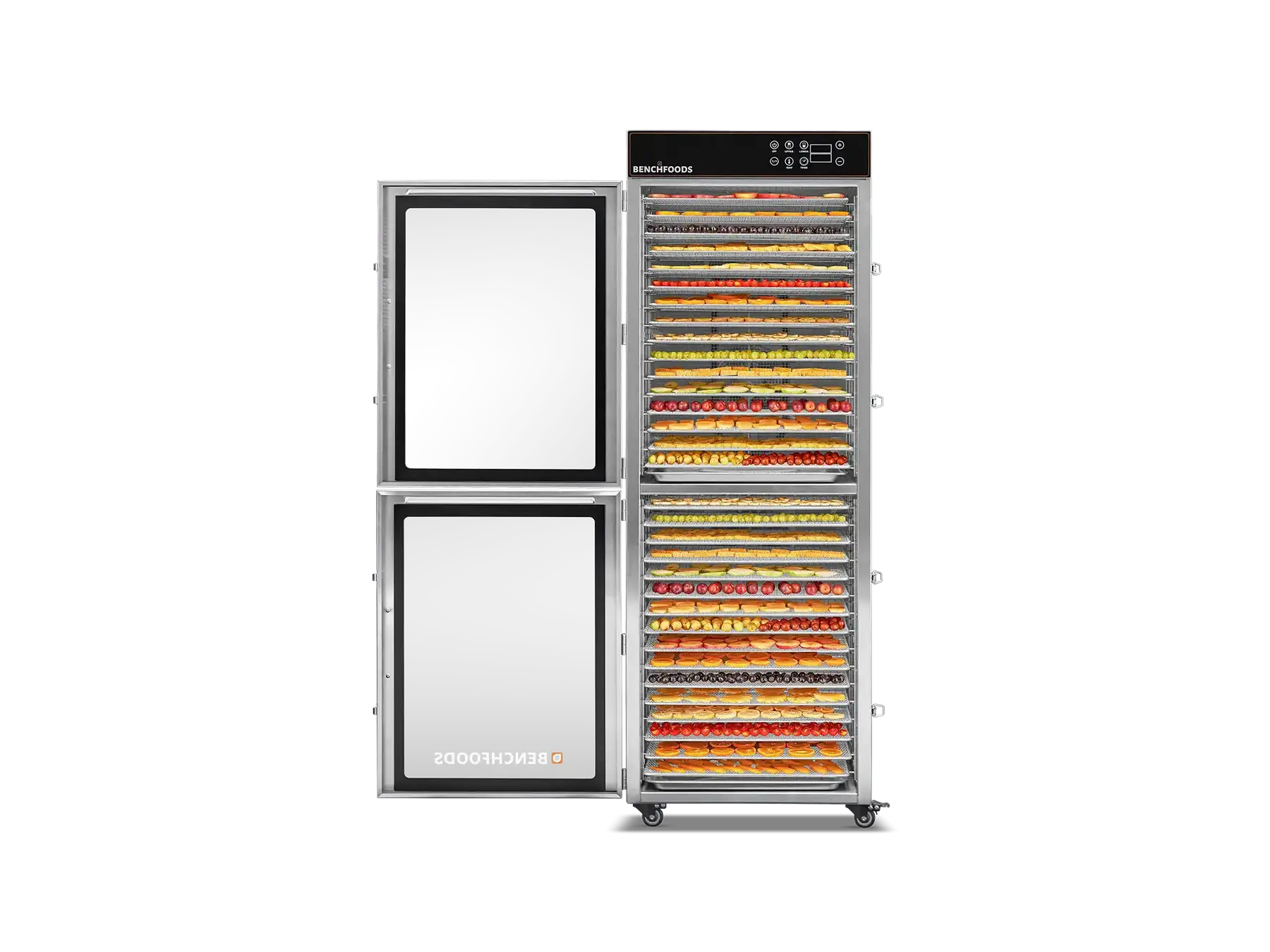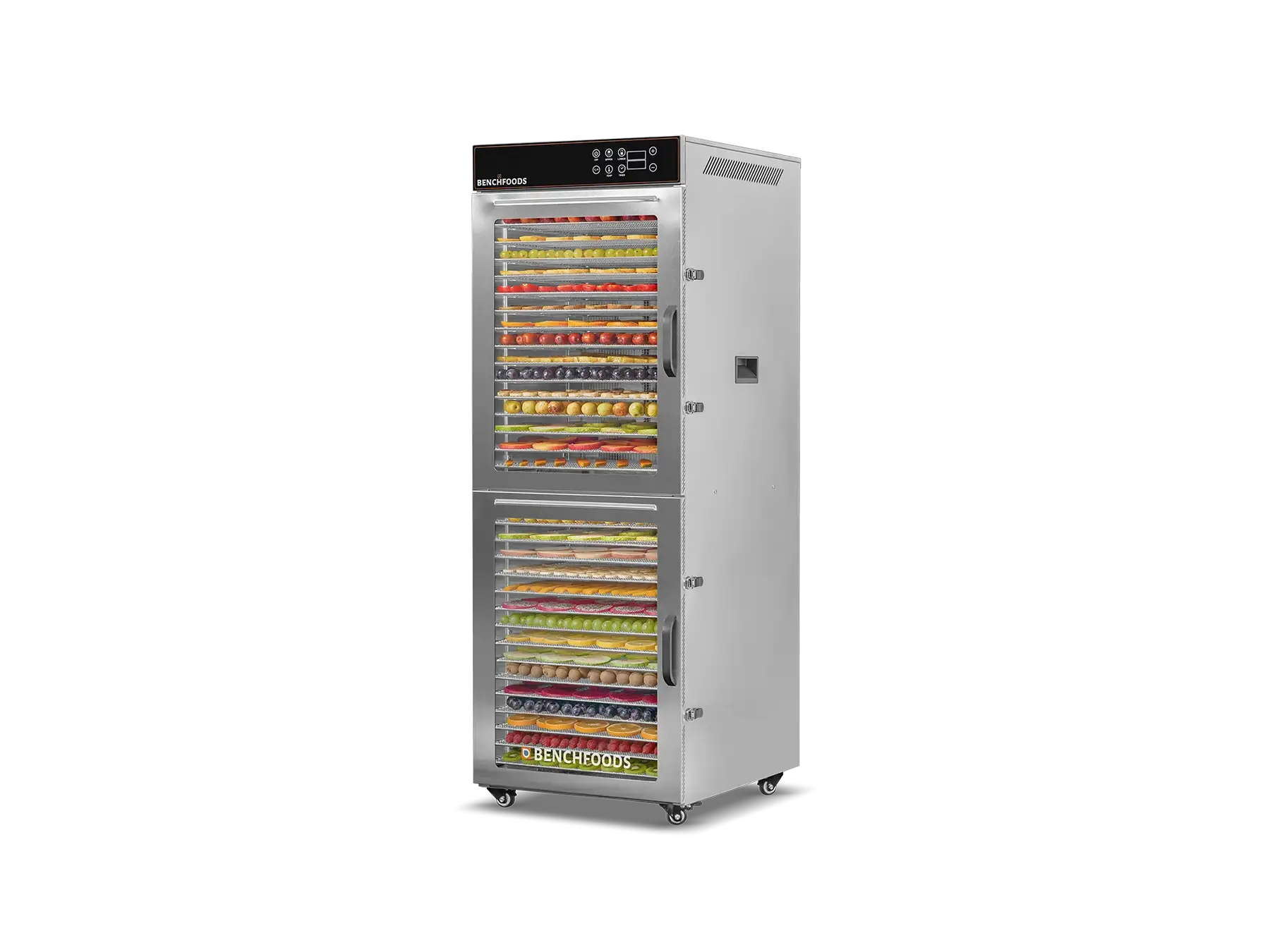 Our Industrial Dehydrators are constructed with the highest quality 304 Food-Grade Stainless Steel available. This stainless steel grade contains higher levels of chromium and nickel, which forms a protective layer on the surface, preventing corrosion (rust), and preventing the formation of bacteria and other microorganisms. Additionally, it’s non-reactive and won’t react with acidic or alkaline substances found in food and cleaning agents. This steel is also very easy to clean and sanitize, which is essential in food production facilities. In summary, using food-grade stainless steel ensures food safety and hygiene by preventing contamination and maintaining the quality of the food being processed.