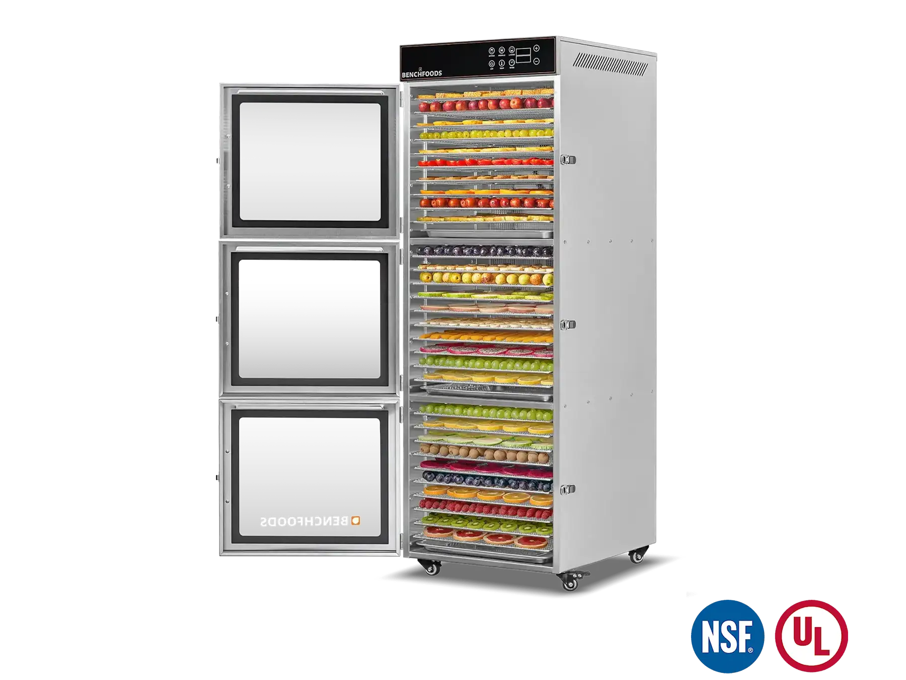 Our Industrial Dehydrators are constructed with the highest quality 304 Food-Grade Stainless Steel available. This stainless steel grade contains higher levels of chromium and nickel, which forms a protective layer on the surface, preventing corrosion (rust), and preventing the formation of bacteria and other microorganisms. Additionally, it’s non-reactive and won’t react with acidic or alkaline substances found in food and cleaning agents. This steel is also very easy to clean and sanitize, which is essential in food production facilities. In summary, using food-grade stainless steel ensures food safety and hygiene by preventing contamination and maintaining the quality of the food being processed.