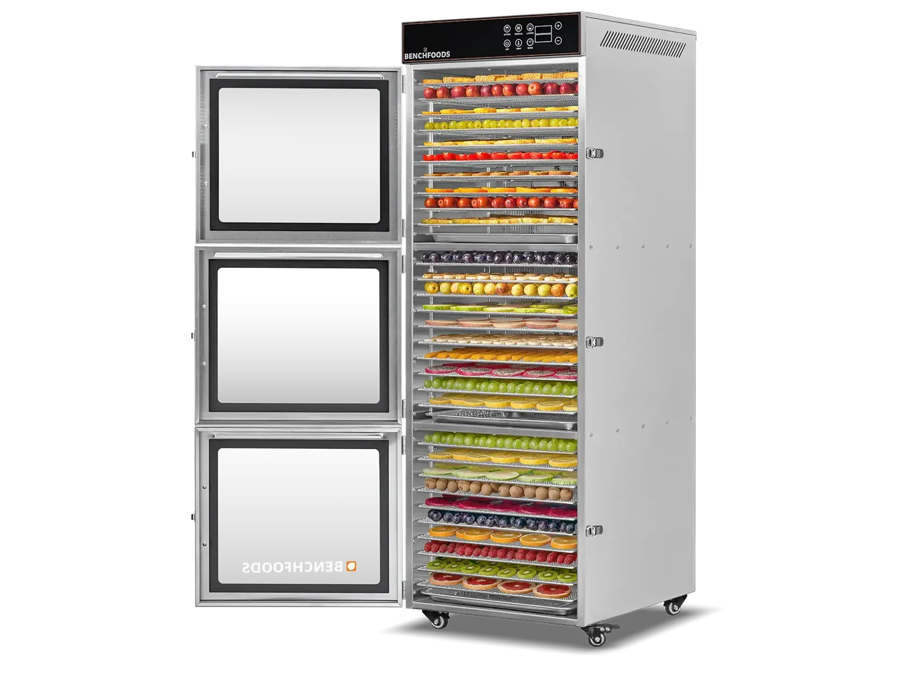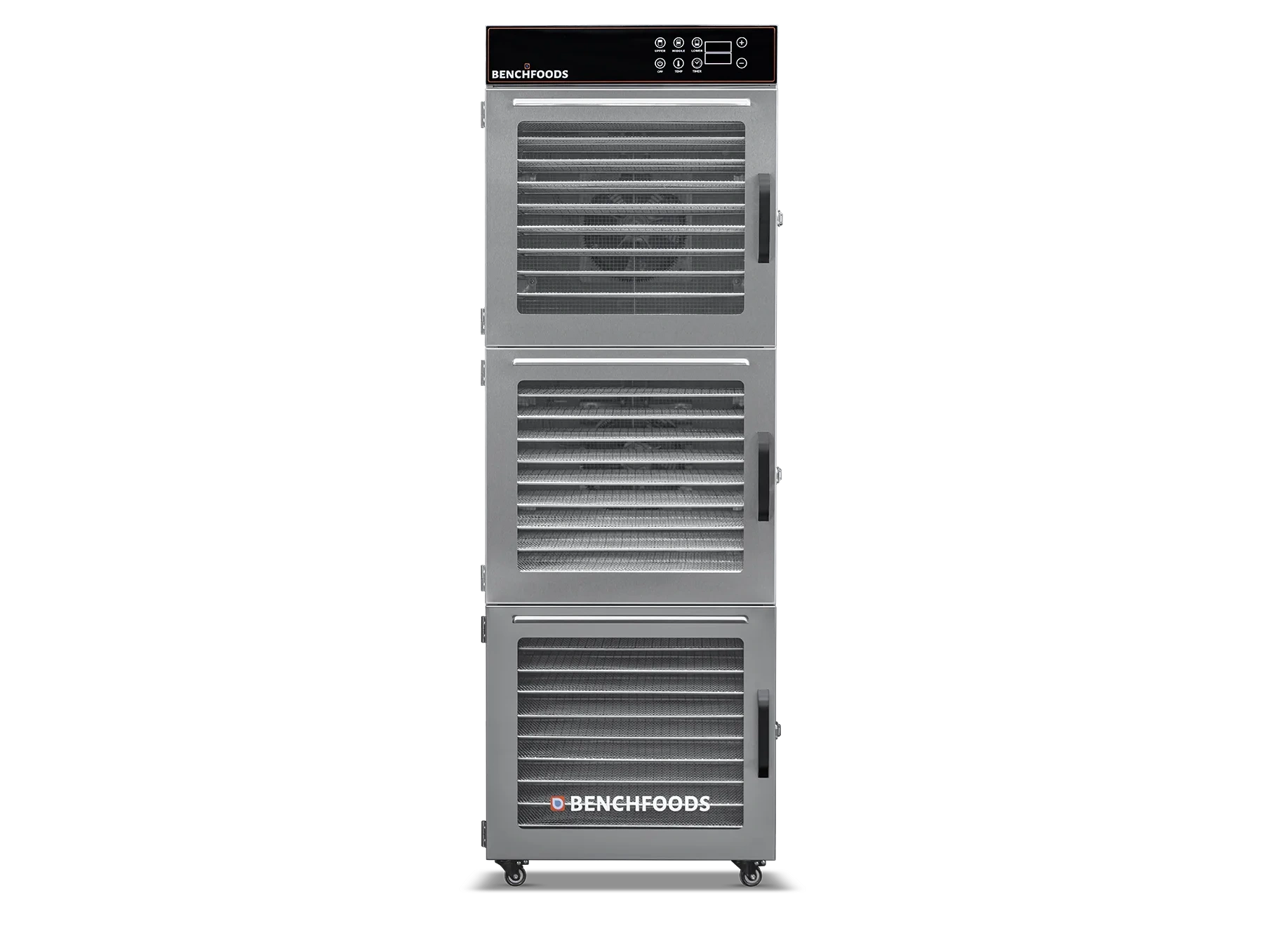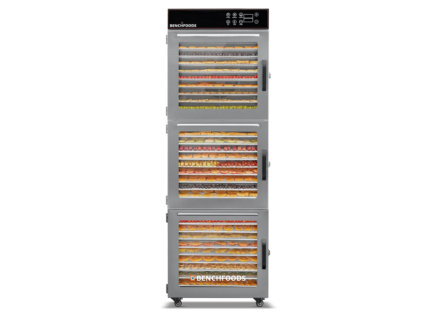 Our Industrial Dehydrators are constructed with the highest quality 304 Food-Grade Stainless Steel available. This stainless steel grade contains higher levels of chromium and nickel, which forms a protective layer on the surface, preventing corrosion (rust), and preventing the formation of bacteria and other microorganisms. Additionally, it’s non-reactive and won’t react with acidic or alkaline substances found in food and cleaning agents. This steel is also very easy to clean and sanitize, which is essential in food production facilities. In summary, using food-grade stainless steel ensures food safety and hygiene by preventing contamination and maintaining the quality of the food being processed.