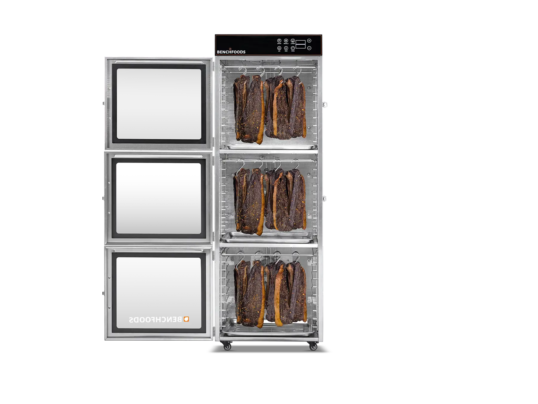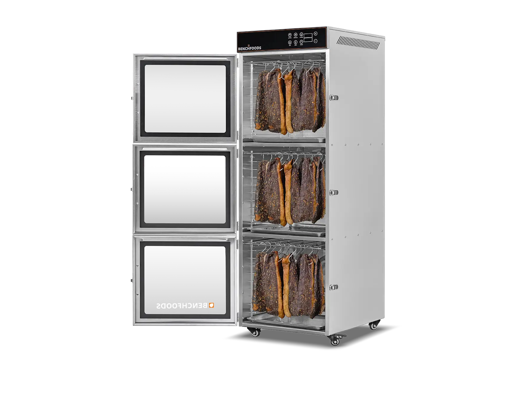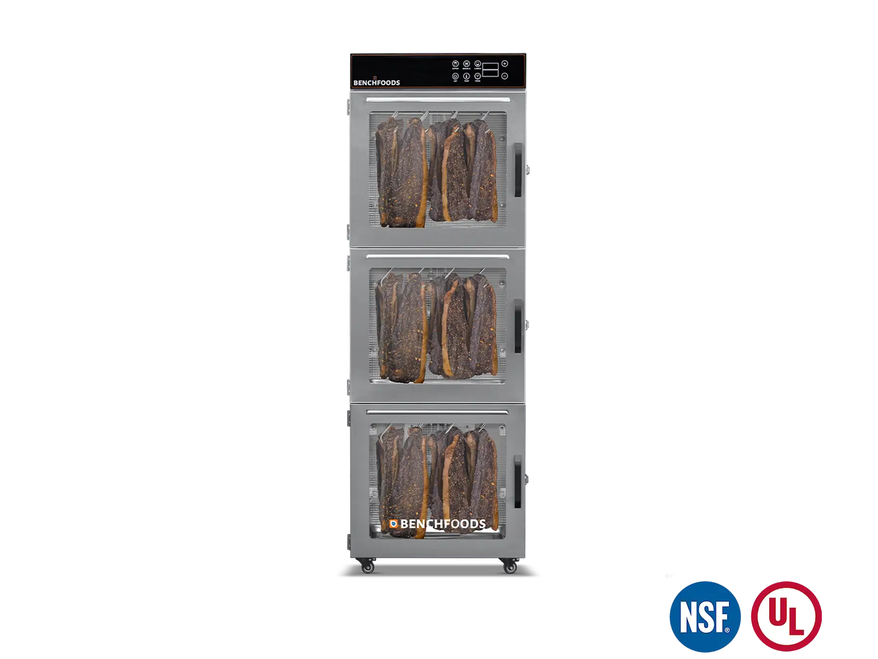 Our unique Programmable Logic Controllers (PLC) enable you to conduct staged drying cycles according to a predetermined recipe. With up to five customizable steps, each with its own programmable temperature and time settings, you can achieve precise and consistent results every time. This feature is particularly useful for “kill-step” processes when making beef jerky and for reducing dry times by starting the cycle with a higher temperature and then gradually decreasing as your product loses its moisture. With this method, you’ll achieve the same product consistency, texture, and appearance in less time without sacrificing quality.